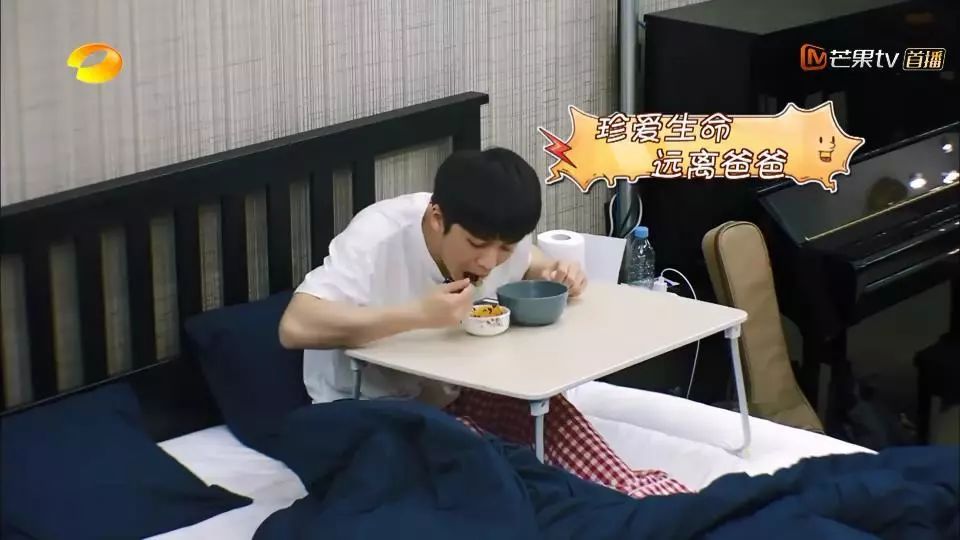 吃饭全靠外卖的武艺,只要接过外卖,紧接着就打开小桌子,然后放到床上。