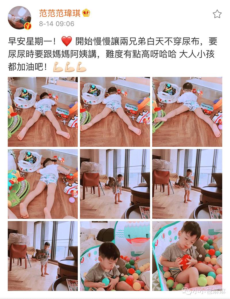这不,前段时间,范范微博上晒出飞翔萌照,并写道:“开始慢慢让两兄弟白天不穿尿布,要尿尿时要跟妈妈阿姨讲,难度有点高呀哈哈 大人小孩都加油吧!