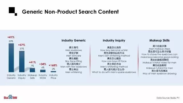 百度17年发布过一份有关男士化妆品的数据,男士化妆品的日均检索量达九万七千次。数据里有7%的内容,都是关于男士化妆技巧的。