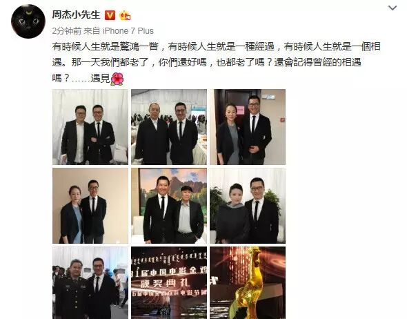 9月17日,周杰深陷还珠之乱后首晒照片,并配文道:“有时候人生就是惊鸿一瞥,有时候人生就是一种经过,有时候人生就是一个相遇。那一天我们都老了,你们还好吗,也都老了吗?还会记得曾经的相遇吗?”照片中周杰与老朋友们合影笑容满面,看来与老朋友再次相聚非常开心。