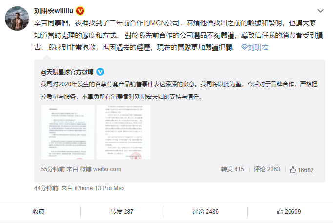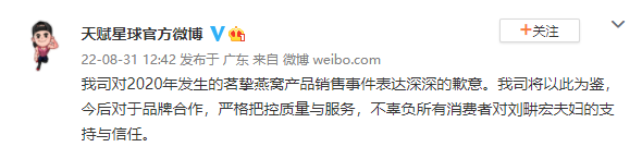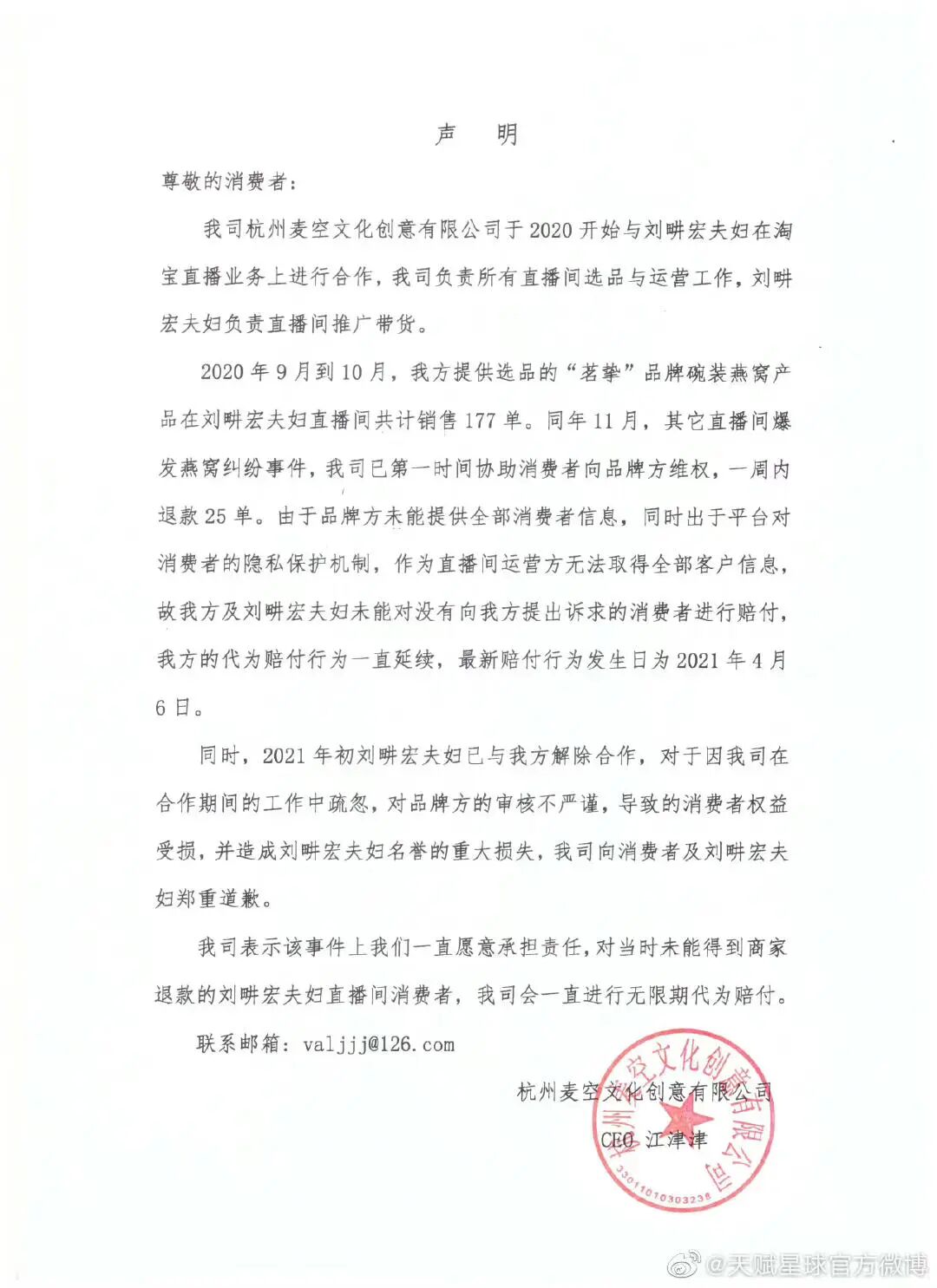 刘畊宏道歉! 湖南交通频道 港台男星 2022-08-31 14:41:00 563 创作不易,用心坚持,欢迎请BaGua喝几杯爱心咖啡!打赏并支持本文 打赏并删除本文 针对网传刘畊宏夫妇卖茗挚燕窝产品假货的消息,8月31日午间,天赋星球官微发布致歉声明称,旗下艺人刘畊宏夫妇曾与杭州麦空创意文化有限公司合作淘宝电商直播。合作过程中,杭州麦空公司确实推荐了茗挚燕窝产品在淘宝直播间直播活动中销售。声明称,经向杭州麦空公司了解,杭州麦空公司的反馈情况为:当时品牌方提供有检验报告,至今品牌方仍未与杭州麦空公司确认,在淘宝直播间所售卖的茗挚燕窝产品与其它平台直播间发生问题的茗挚燕窝产品是否为同批次商品。天赋星球表示,刘畊宏夫妇已要求并督促杭州麦空公司妥善处理上述事件,并对消费者进行依法退赔。基于受限于淘宝平台对消费者个人信息的保护,公司无法取得消费者联系方式,但对于2020年在公司艺人淘宝直播间购买过茗挚燕窝产品的消费者的退款退赔要求,公司愿意承担所有费用。随后,刘畊宏本人也通过微博道歉,“对于我先前合作的公司选品不够严谨,导致信任我的消费者受到损害,我感到非常抱歉,也因过去的经历,现在的团队更加严谨把关。”同日,杭州麦空公司亦发布声明称,对于因公司在合作期间的工作中疏忽,对品牌方的审核不严谨,导致的消费者权益受损,并造成刘畊宏夫妇名誉的重大损失,公司向消费者及刘畊宏夫妇郑重道歉。对当时未能得到商家退款的刘畊宏夫妇直播间消费者,公司会一直进行无限期代为赔付。来源:界面新闻、新浪微博审稿:国生、康铁、菲菲 创作不易,用心坚持,欢迎请BaGua喝几杯爱心咖啡!打赏并支持本文 打赏并删除本文 感谢您的支持鼓励,我会继续努力的!文章地址:用户邮箱:打赏金额:USDT 请输入数字点击”去打赏“,即可进行打赏支持本文章哦 刘畊宏 About the Author 湖南交通频道 功能介绍:爱心广播 平安调频 欢迎大家来湖南交通频道参与微信语音报路况或节目互动. 官方认证:湖南广播电视台广播传媒中心 Related Posts 刘畊宏道歉! 2022-08-31 14:41:00 刚刚,新歌王诞生了!没错,就是Ta! 2018-04-13 22:16:15 5年不换车的人,是因为穷吗?调查结果惊人! 2017-11-06 19:04:07 汪涵的朋友圈亮了!! 2017-04-19 19:25:28 林忆莲《歌手》夺冠后,她做的第一件事居然是… 2017-04-16 09:42:13 发表评论