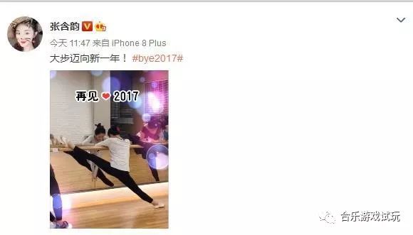 2017余额已经不足,2018年即将到来,很多明星们纷纷晒照迎接新年的到来。12月31日,张含韵也晒出了自己的一张照片,还配文写道“大步迈向新一年!bye2017”。