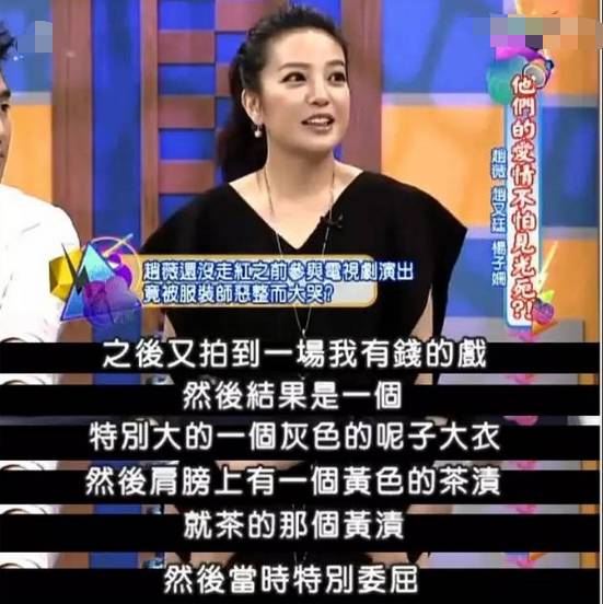 赵薇曾在节目上透露,在她出道没多久的时候,被一些演员和服装师联合起来欺负,给她的戏服全都是最丑的 还骗她说等你有钱的时候就给你穿好衣服。