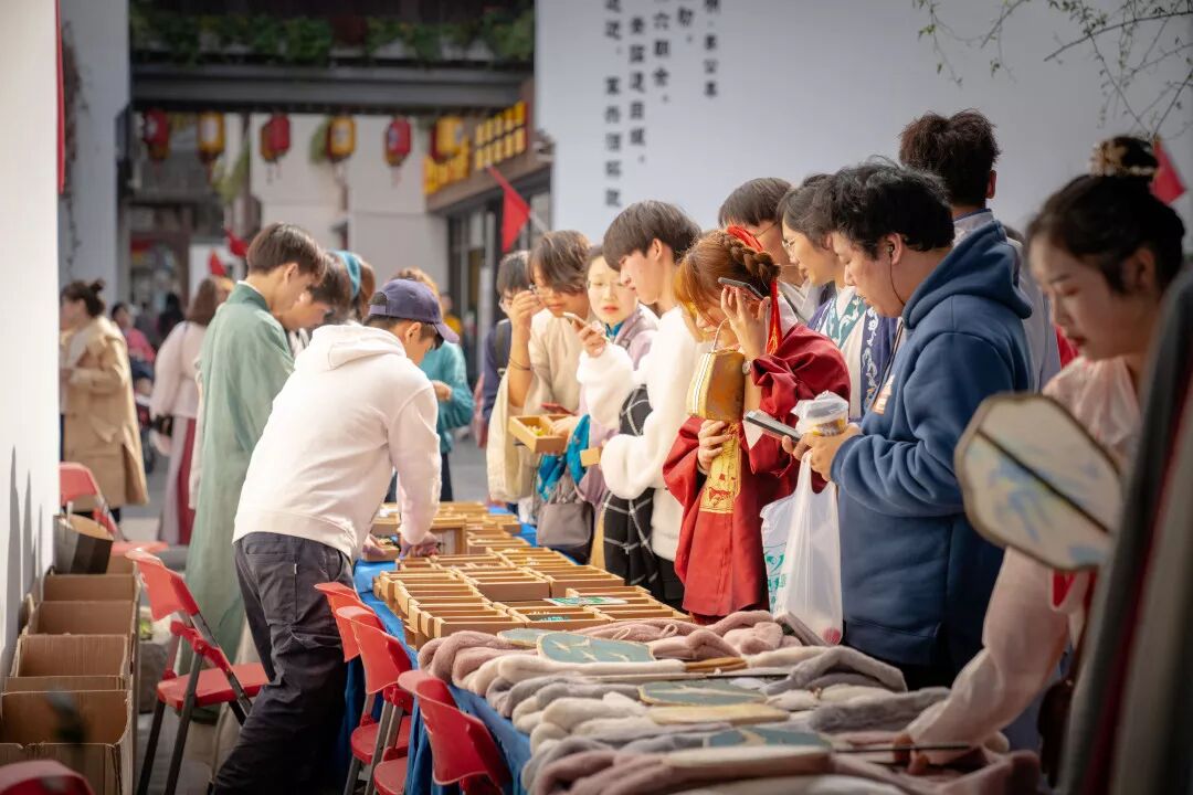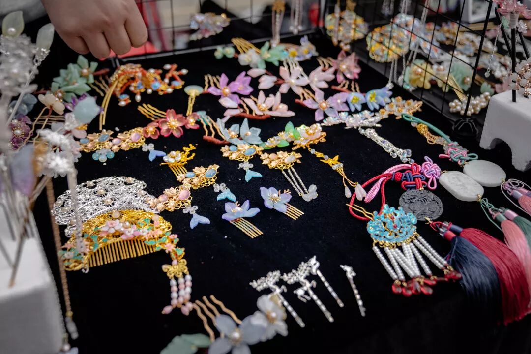 熙南里最核心的文化,是非遗和戏曲。在整个汉服节的打造中,这个特点也被充分突出起来。在街区内的国风集市区内,琳琅满目的商品都带着浓浓的中国风,古色古香的发簪、香包、传统的手工制品,吸引着身着各色汉服的游人们的目光。