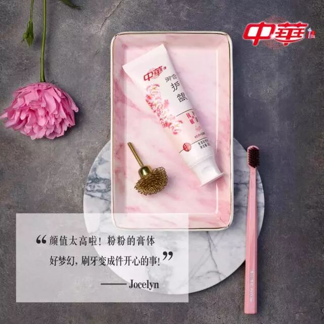 除了包装精美,这款中华御齿护龈牙膏的开盖方式也很独特,按盖式的开口很人性化,挤出来的牙膏也是粉嫩粉嫩的,闻起来有淡淡的牡丹花香味,刷完牙之后连说话也自带香味。