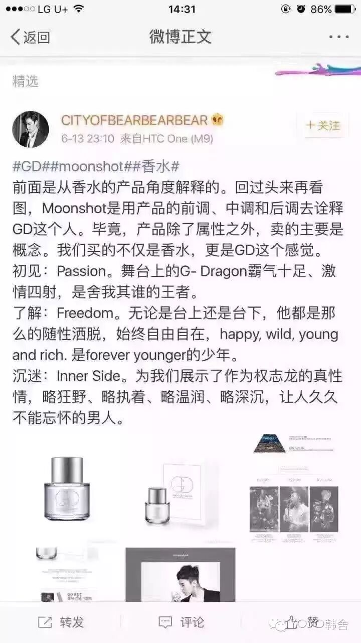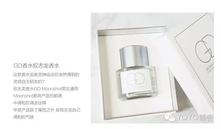 【权志龙GD香水】全球限量版,看你们慢慢抢~ YOYO韩舍 日韩男星 2016-08-31 22:29:55 283 创作不易,用心坚持,欢迎请BaGua喝几杯爱心咖啡!打赏并支持本文 打赏并删除本文 新朋友:点击标题下面蓝色字“YOYO韩舍”关注老朋友:点击屏幕右上角,转发或分享本页面搜索微信平台:yoyohanshe专业批发韩国正品化妆品——yoyo韩舍官方微信平台,关注我们为您提供最及时最丰富的韩国美妆、时尚、旅游、整形等各类信息更新,没有垃圾资讯哦,还有机器人自动解答疑问,无聊还能陪掉节操唠嗑儿~~韩国代购Gd moonshot 香水 moonshot最新上的香水,男女都可以用哦~ 正常规格50ml 融合了GD本人想法意见的此款香水为限量版,数量有限,售完为止!GD本人也表明很喜欢哦!前调柠檬 柑橘 葡萄柚 雪松中调鼠尾草 海藻 茉莉 竹子 后调琥珀 雪松 麝香 广藿香整体味道比较清淡 留香时间几个小时,淡淡的海洋味道 男友的味道 科科科科,设计也很简洁的命名香水 外包装是GD噢~Moonshot是用产品的前调、中调和后调去诠释毕竟产品除了属性之外,卖的主要是概念。初见:舞台上的霸气十足、激情四射了解:无论是台上还是台下,他都是那么的随性洒脱,始终自由自在是forever younger的少年。沉迷:为我们展示了作为权志龙的真性情,略狂野、略执着、略温润、略深沉,让人久久不忘。 创作不易,用心坚持,欢迎请BaGua喝几杯爱心咖啡!打赏并支持本文 打赏并删除本文 感谢您的支持鼓励,我会继续努力的!文章地址:用户邮箱:打赏金额:USDT 请输入数字点击”去打赏“,即可进行打赏支持本文章哦 权志龙 About the Author YOYO韩舍 功能介绍:YOYO韩舍咨询账号 Related Posts 【权志龙GD香水】全球限量版,看你们慢慢抢~ 2016-08-31 22:29:55 发表评论