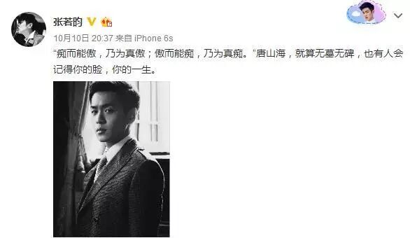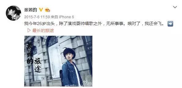 在一年多前见过张若昀,当时还没有听过他的名字,因为太满的工作行程那次的拍摄也交给了别的同事,因此只是负责了后期的问题采访等。上楼探班了几分钟拍摄现场,看到那时的张若昀:安静、腼腆、感觉不善言语、左右眼睛大小不一,青春气息扑面而来!匆匆拍摄结束也就离去。但就是在整理采访文案时,去逛了一圈他的微博,才发现这位少年的逗逼属性以及经常会发一些让人看过去很酷很靠谱的句子,比如下面这些: