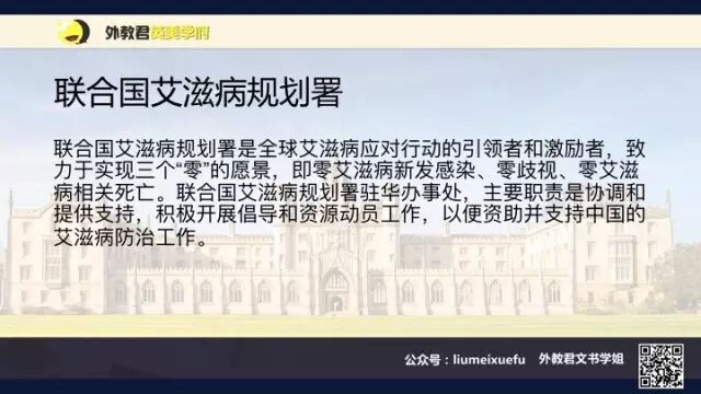 以UNAIDS为例,它是全球范围内组织、推广及协调世界艾滋病运动的机构。规划署旨在唤起全球对艾滋病的认识并作出承诺,其目的在于充分发挥联合国系统的多样性,使其成为全球150多个国家强有力的和独特的合作伙伴,以减缓艾滋病流行及减轻其对发展造成的影响。