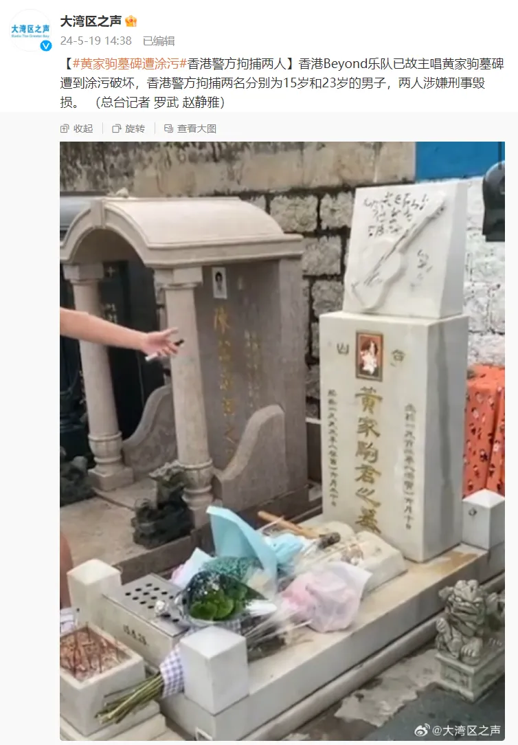 据@大湾区之声:香港Beyond乐队已故主唱黄家驹墓碑遭到涂污破坏,香港警方拘捕两名分别为15岁和23岁的男子,两人涉嫌刑事毁损。