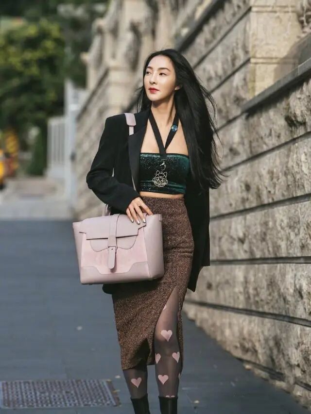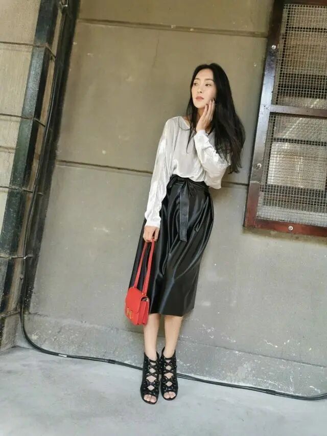 一款特殊的长衫,宽松的设计和特殊的布料都让整件衣服充满了设计感,下半身更是搭配一款皮裙,再加上脚下一双镂空元素的高跟鞋,这样的一身真的是端庄大气,令人感叹曹格真的是有福气,再加上手里拎的一款红色包包,不仅在色调上有了层次感,更让整体多了一丝妩媚。