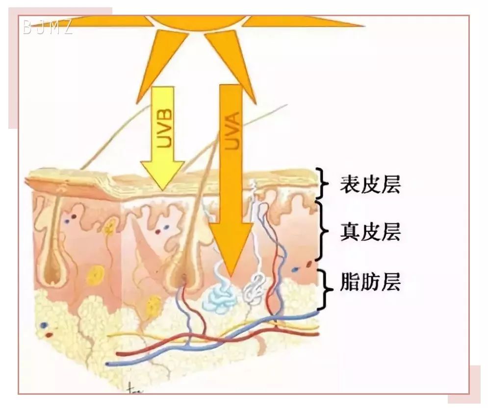 UVA:可怕的阳光杀手,它藉着波长比较长,穿透能力强的本领。可以穿透皮肤表层,深入真皮以下组织,可以破坏胶原蛋白,弹性纤维组织等皮肤内部的微细结构,使皮肤晒黑、老化。
