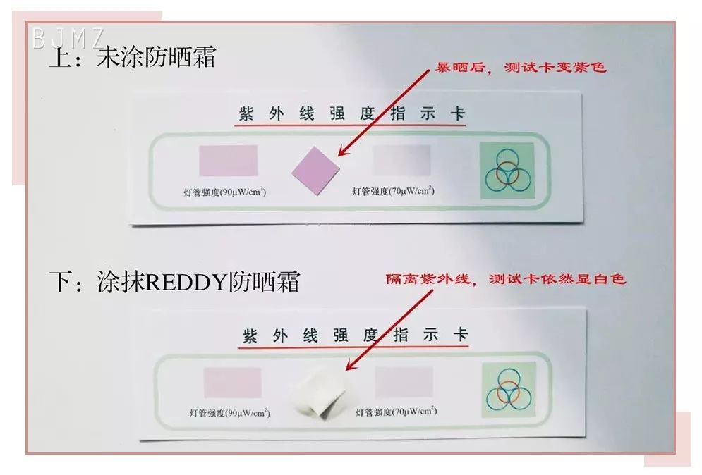 用紫外线测试卡来测评它的防晒力:测试卡中间位置的正方形小卡片原本是白色,经紫外线照射后会变成紫色。