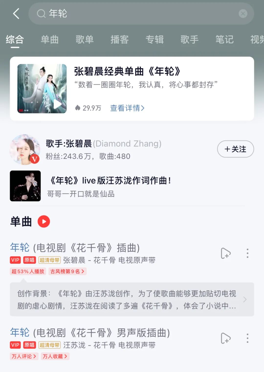 据了解,2015年《花千骨》电视剧插曲《年轮》由张碧晨演唱女生版(6月15日发行),汪苏泷演唱男声版(6月30日发行),两版本同期收录于官方原声带。