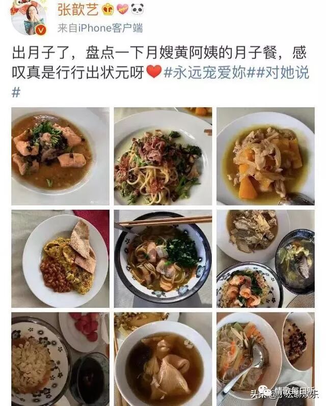 坚持母乳喂养儿子的张歆艺,虽然已经走上了减脂瘦身之路,但是其进食的营养一点也不落下,从月子餐的九宫格可以看出,月嫂黄阿姨的营养搭配非常得当,全是催奶所需的高蛋白食材,回想起自己被黄阿姨每天好吃好喝招待的1个月,张歆艺现在还有点怀念。所以才会忍不住跟大家分享了黄阿姨超高手艺的不重样月子餐,看得不少网友都羡慕了,毕竟很多普通人坐月子的时候,除了鸡蛋还是鸡蛋呀!