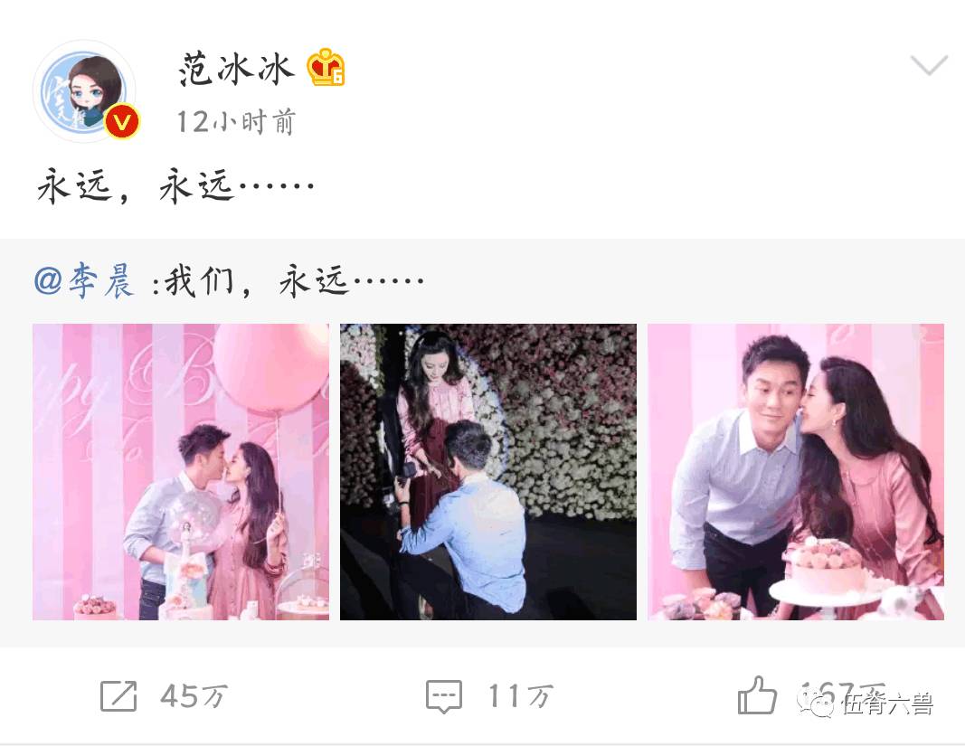 2015年5月29,范冰冰和李晨晒恩爱合照高调宣布恋情。2017年9月16日,李晨在范冰冰生日会上求婚,两年恋情终修得正果。这大概是一段恋情中最好的消息:从执手开始,就知道我们终会是夫妻。