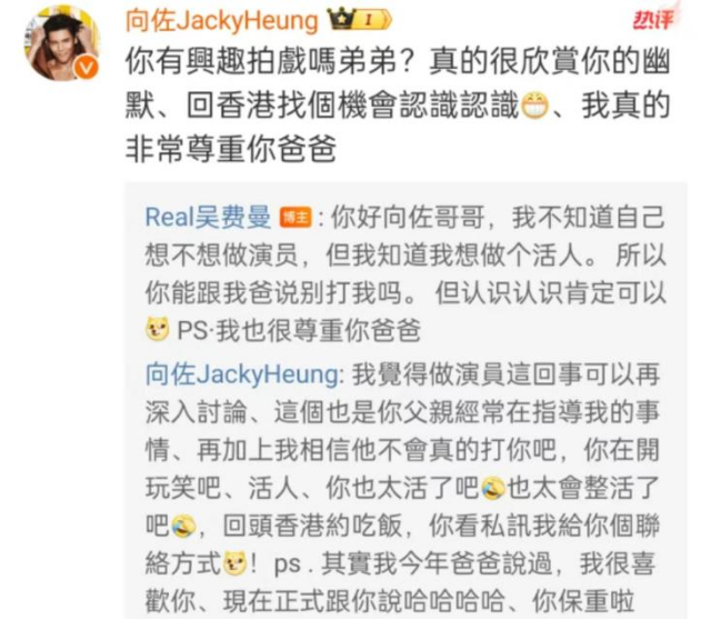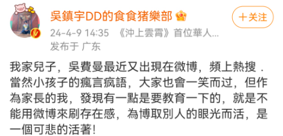 当然,尽管吴镇宇几乎不管费曼在社交平台上各种“大逆不道”的发言,但在儿子言行不当时,他也会及时给予警告和引导。