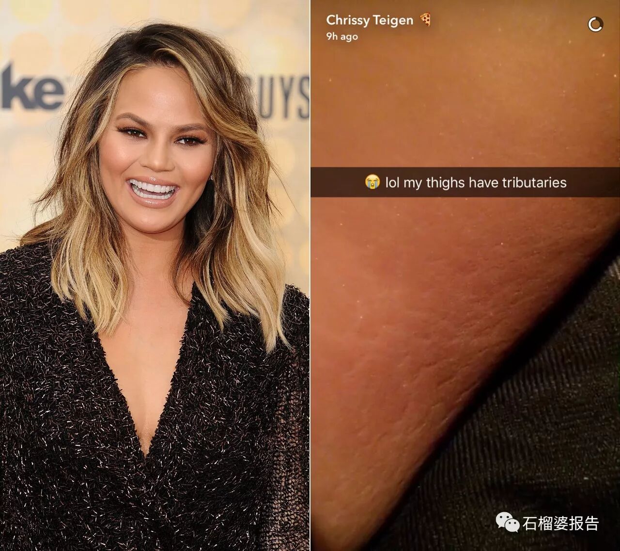 Chrissy Teigen是模特,怀孕期间曾经自拍大腿上的纹路(下图)。