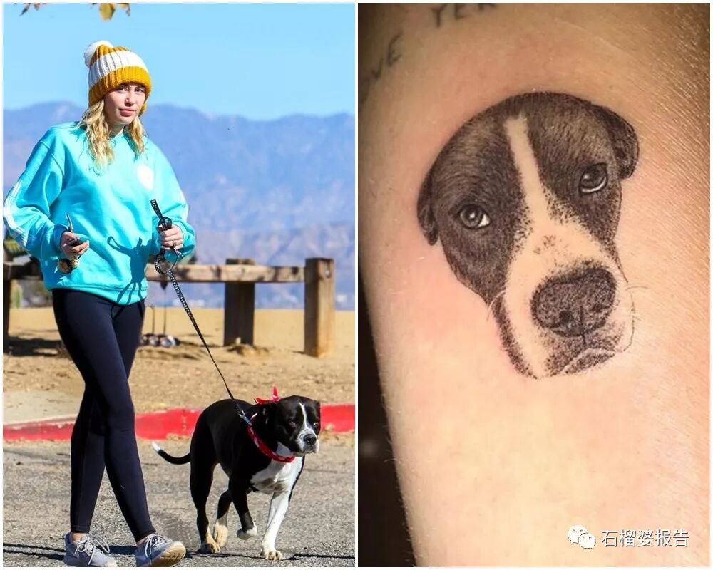 5,麦莉跟她的宠物狗狗Mary Jane散步。月初她把狗狗文在了身上。