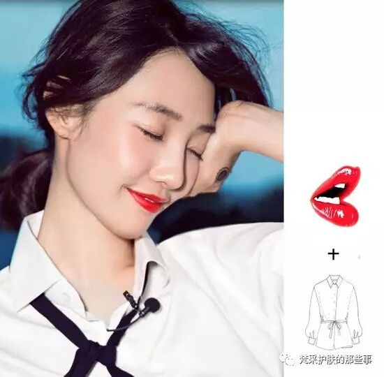当你的衣服不是正儿八经的正红色的时候,你大可直接选择而与衣服颜色一模一样的红色唇膏,要知道同色系搭配是最省脑子最快速的方法了。但是!当你的衣服是正红色时还是要选择比衣服浅一色或者深一色的唇膏哦。