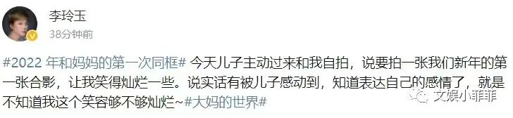 1月1日,演员李玲玉在社交平台上更新一则动态,晒出今年与儿子的第一张自拍照,还表示自己特别感动。