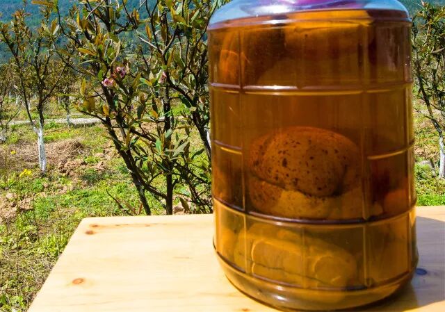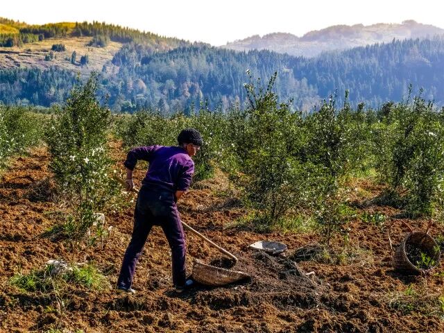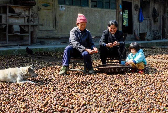 山中的小木屋前,铺满了油茶果。老人在剥壳取果,孩子在旁边乐呵,慵懒的小狗享受着阳光,聋拉着耳朵。