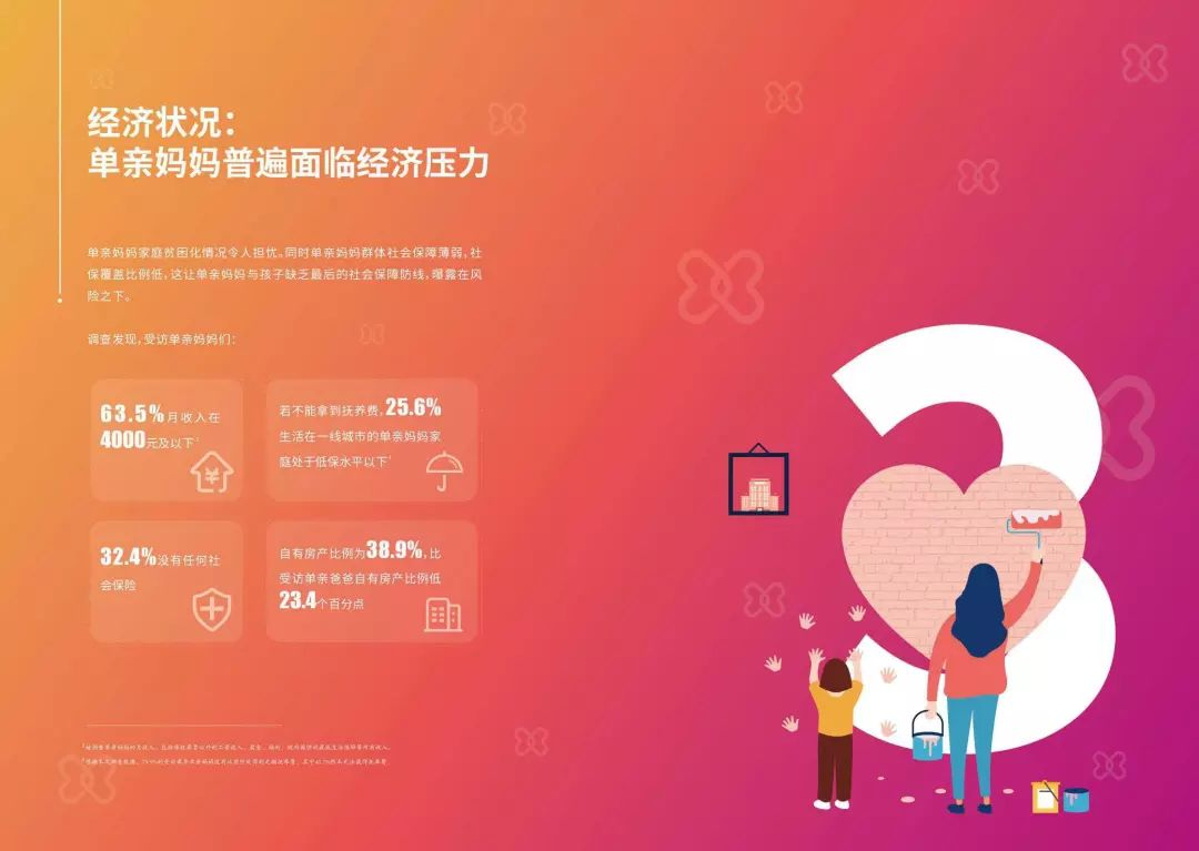 2018年1月,唯品会曾经做过一次单亲妈妈数据调研,面向全国四大城市600名单亲妈妈,虽然超过60%的单亲妈妈有工作,但收入500元以下的占8%,30%左右的单亲妈妈收入在3000元左右,6000元已经算是高工资。