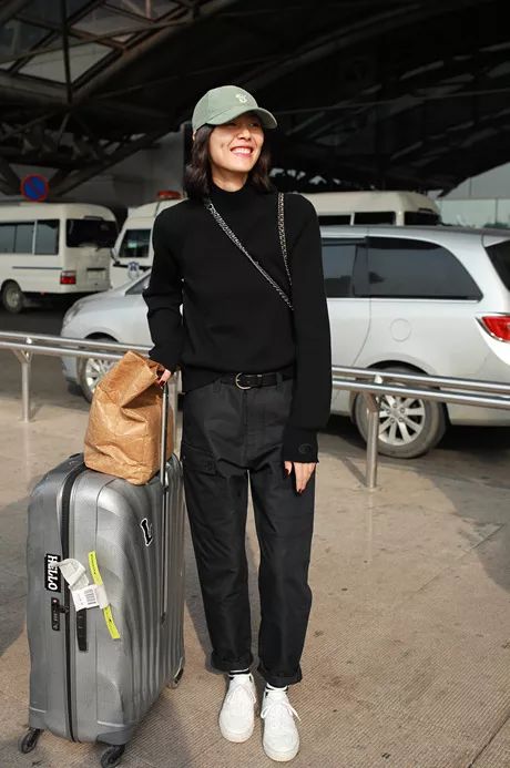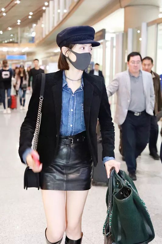 宋茜则是灯芯绒的西装配短裙,美丽就是有点儿冻人~