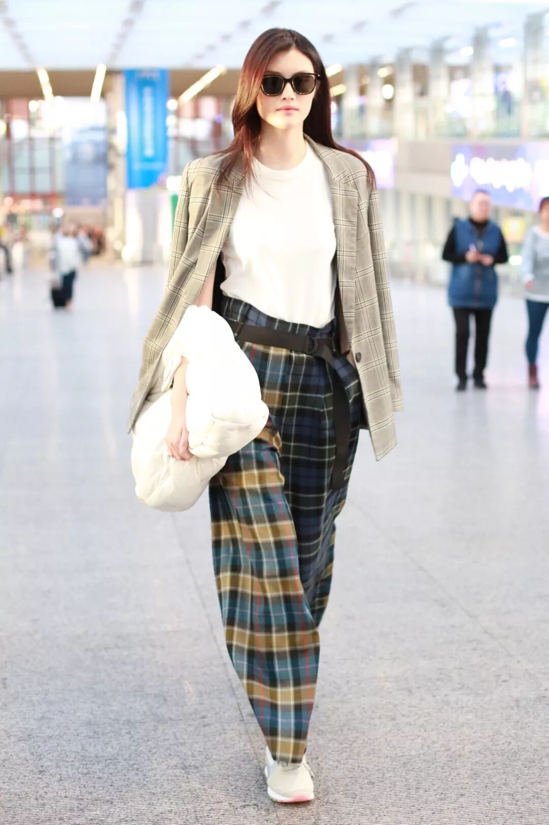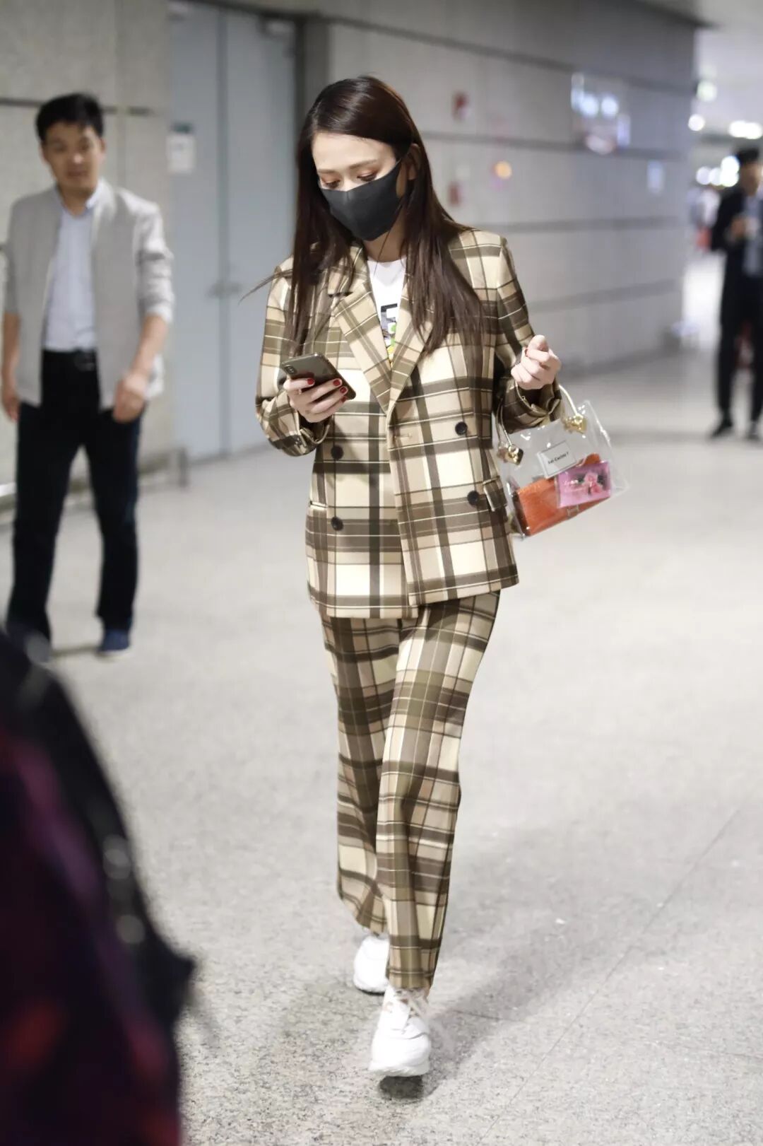 另一件则是经典的灰色格纹西装,她很大胆的搭配了一条格纹裤。