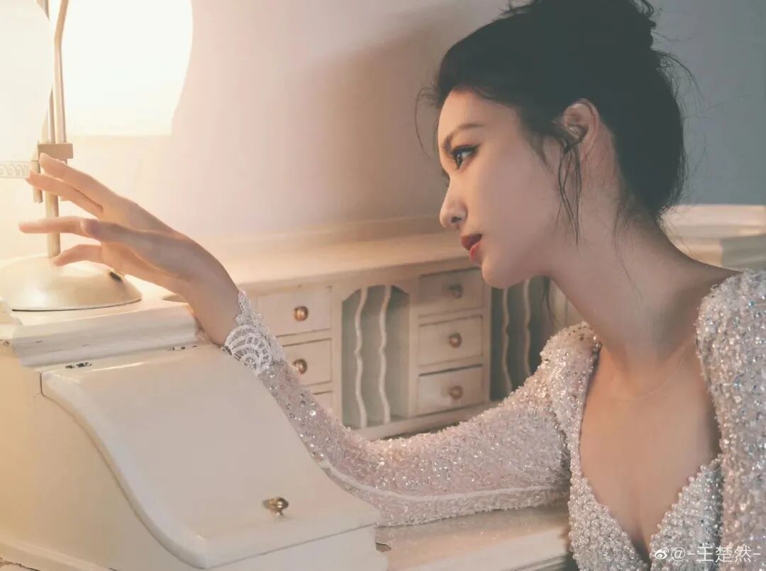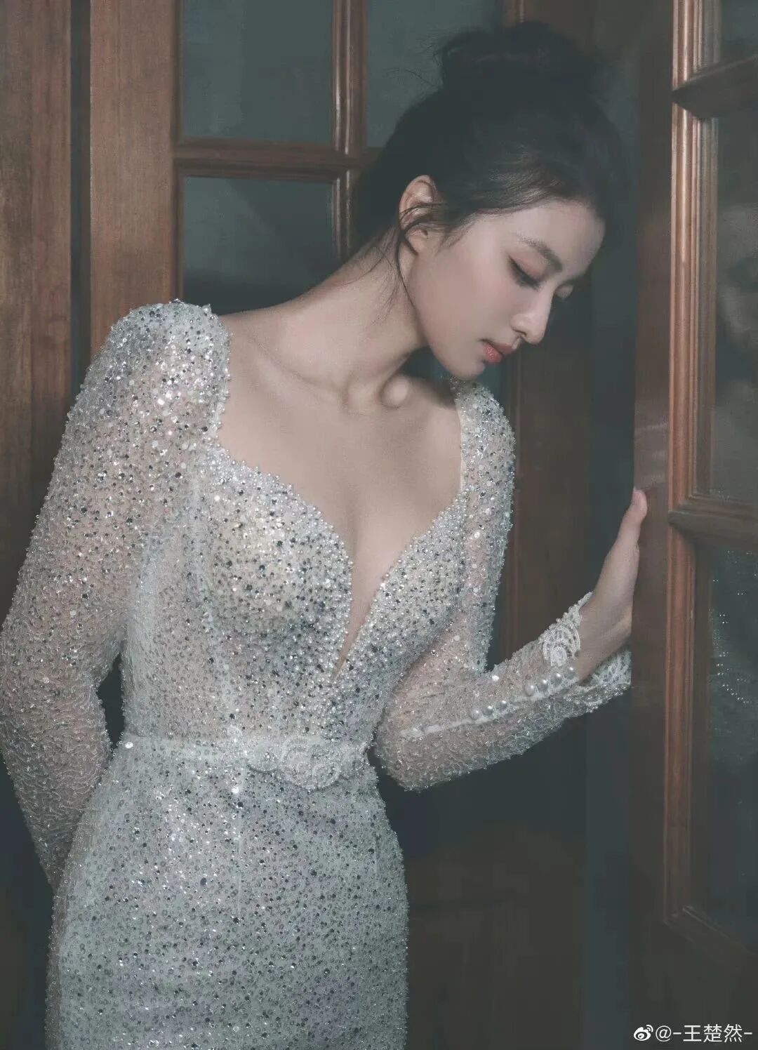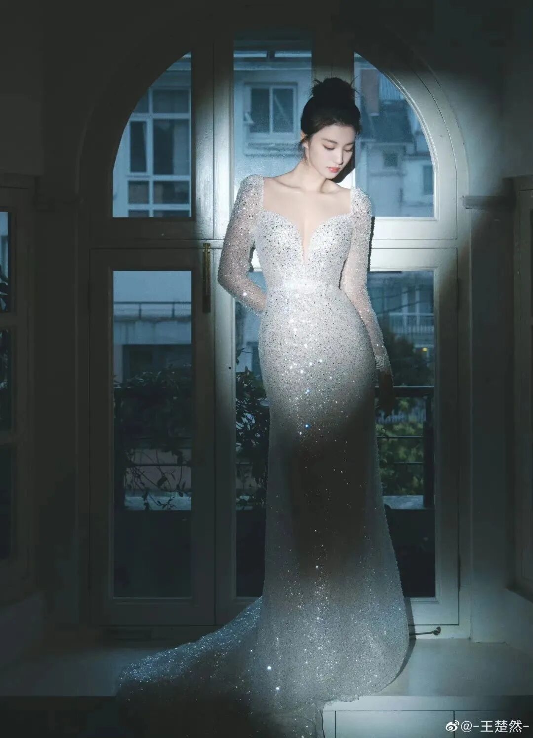 长卷发高高盘起,搭配上白色星钻礼服,将修长优美的肩颈完美显现,没有华丽繁杂的妆容以及饰品点缀却依旧能够轻松夺目。