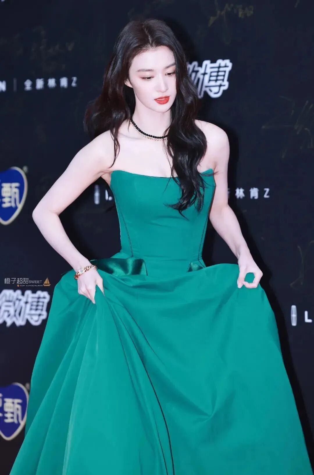 除了复古的港风大波浪和绿色长裙,王楚然的第二套造型丝毫不输第一套。