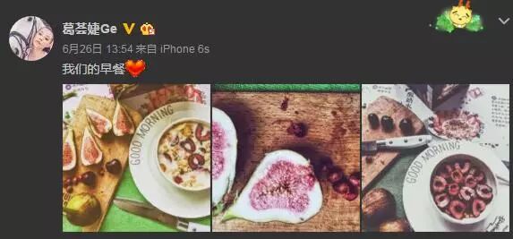 6月26日,摄影师童梦晒出三张早餐的照片,附文称“做周末早餐给自己爱的人吃,是一件重要的小事”。葛荟婕也晒出一样的照片,附文称“我们的早餐”。
