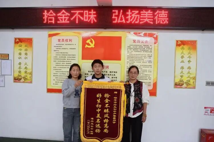10月31日,王女士经过多方打听,专程来到了尹馨磐就读的邹平市好生中学送上锦旗表达感谢,对尹馨磐同学拾金不昧的高尚品德给予高度评价,对学校德育教育给予高度赞扬。