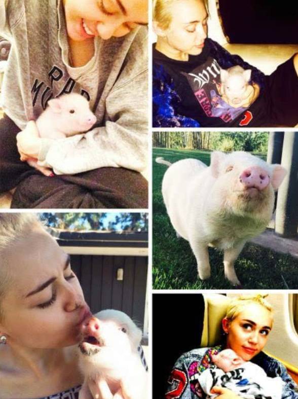 Miley Cyrus是明星中出了名的爱宠狂人,养了好多狗狗不说,最近她还养了只名叫Bubba Sue的小香猪!在Louisville收到这只肉肉的小胖墩后,Miley当即带她上了私人飞机奔赴下一个巡演,并给Bubba Sue涂上红色的指甲油。看的出Miley特别宠爱这只小猪,除了抱着经常上镜还带她四处旅游。希望Bubba Sue能好好维持体重,万一发福长太大,可再也不能跟着主人全球巡演咯。