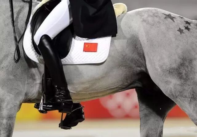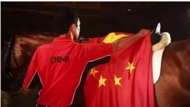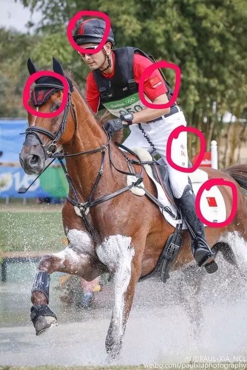 其它国家马术选手参赛,只有头盔和马鞍垫上有国旗,马头、马屁股、裤子、衣服徽章上的中国标识都是华天自己弄的(华天给自己的每一只马的马背都会纹上五星红旗)。