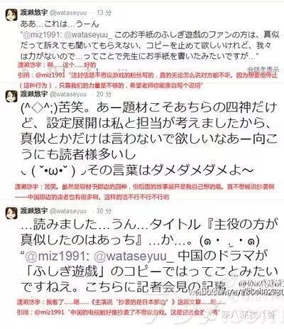 后来渡濑悠宇就在网上说否认借鉴这件事。濑悠说只有四大神兽【东方青龙,西方白虎,南方朱雀,北方玄武】的灵感是来源于书,但是动漫的剧情都是自己想出来哒。