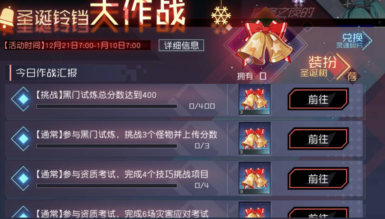 本次核心活动之一,日常任务。每天早上7点刷新。一天八个任务,全清了数了下可以拿到26个左右的铃铛,是完成装扮圣诞树活动的主要途径。