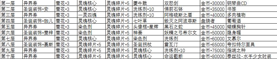 那其实装扮圣诞树这个活动难度其实就没想象中的高了,无非就是肝度乘以时间的问题。那么关心的问题来了,圣诞树活动,我们可以获得哪些东西呢?来,看下图我编辑的表格。