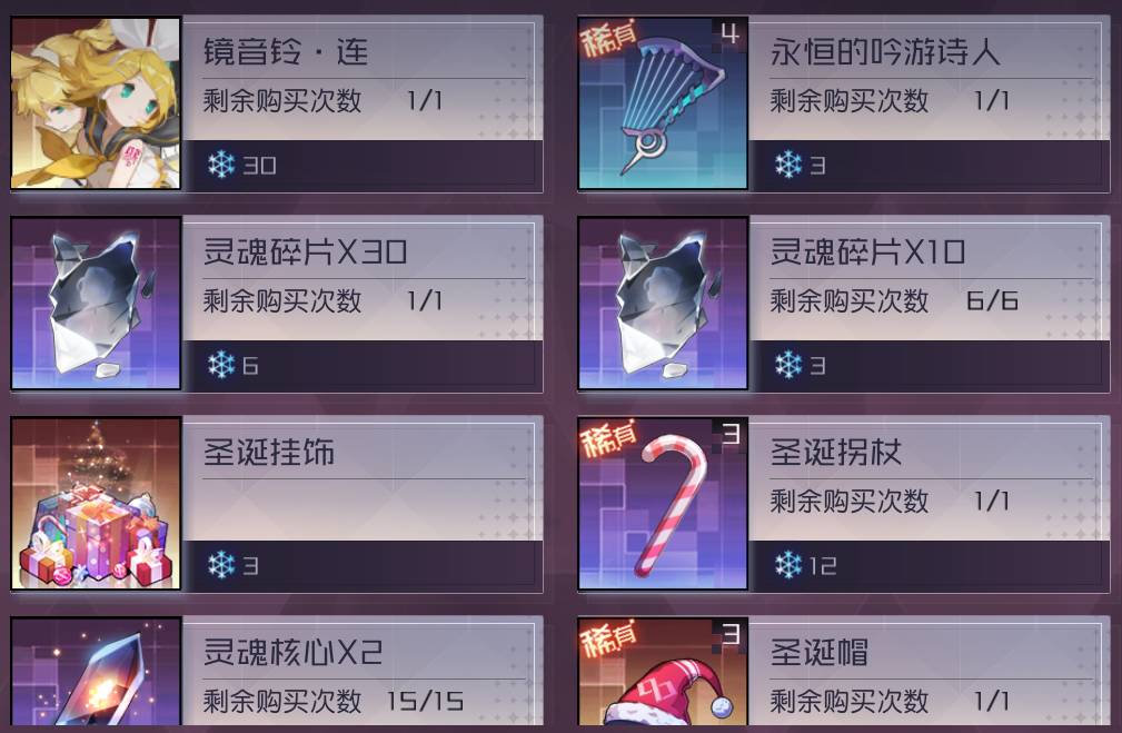 其中最值得关注的有镜音铃·连、圣诞挂饰、圣诞拐杖、圣诞帽、圣诞服这几个兑换品。我知道你们一定最关心神器使,稍后我会算算如何无氪拿到镜音铃·连。至于圣诞挂饰和圣诞拐杖都可以通过肝装饰圣诞树获得,所以并不是很重要,比较残念的是圣诞帽和圣诞服。可能就需要氪一下才能拿到了(PS:三个圣诞影装貌似都有特殊动画效果)