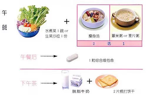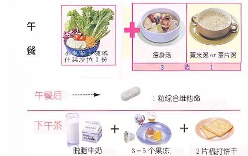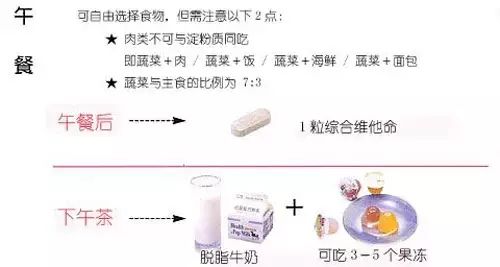 午餐后记得补充符合维他命。在饥肠辘辘的下午可以喝脱脂牛奶(或无糖豆浆1杯),苏打饼干1~3片,还可以吃1~2个果冻,当然要注意它的含糖量~