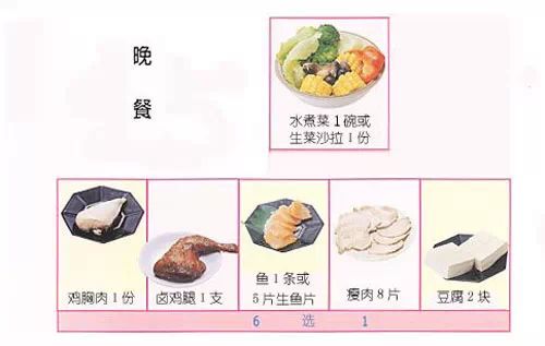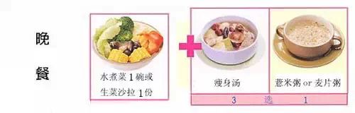 晚餐:水煮菜1碗或生菜沙拉1份(勿加沙拉酱)或是下面组合中的: