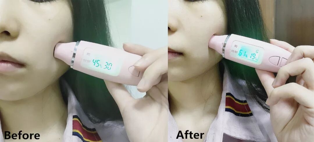 我擦粉底之前有测试过水分,使用小红瓶和小红弹之前,皮肤的油分整体偏高,而水分只有45%,但在使用小红瓶和小红弹之后,水分却可以达到61%,而且出油情况也被控制到了很低的数值。