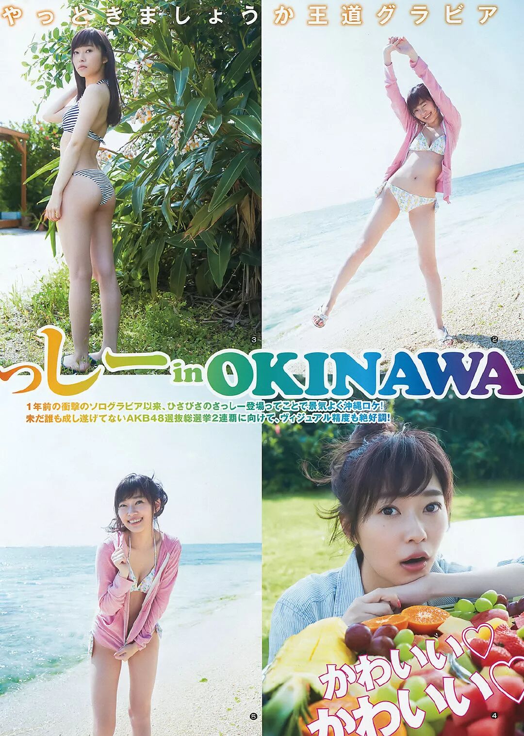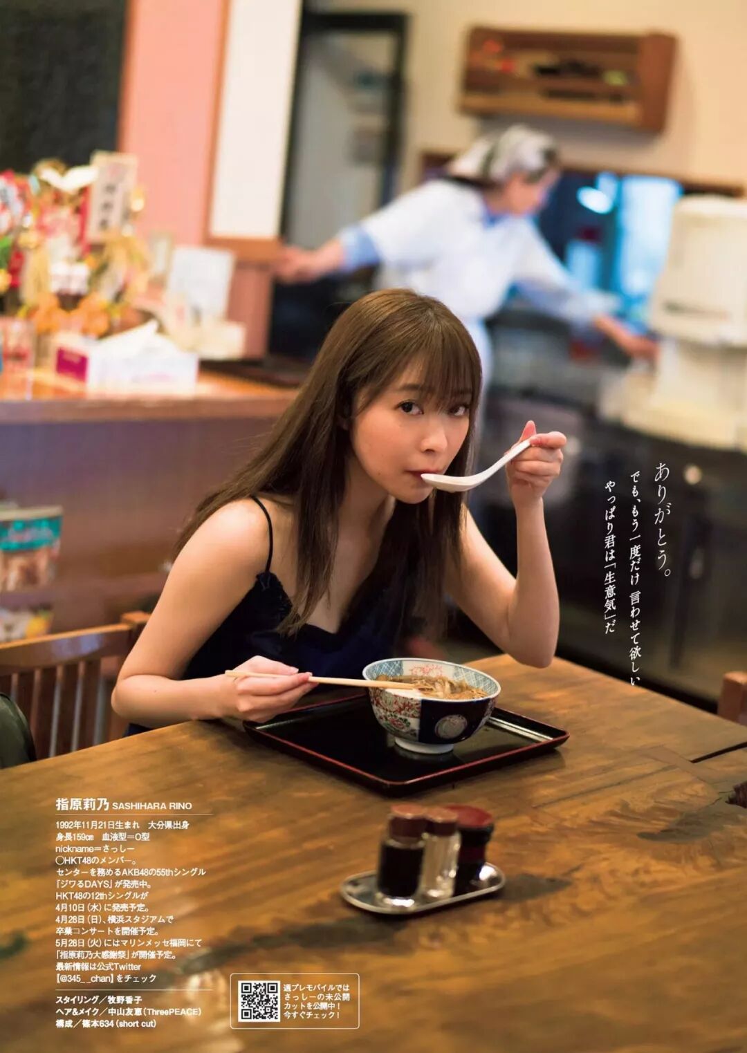 ◯HKT48のメンバー。センターを務めるAKB48の55thシングル『ジワるDAYS』が発売中。HKT48の12thシングルが4月10日(水)に発売予定。4月28日(日)、横浜スタジアムで卒業コンサートを開催予定。5月28日(火)にはマリンメッセ福岡にて「指原莉乃大感謝祭」が開催予定。