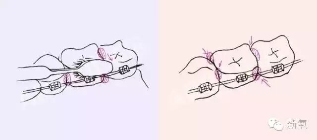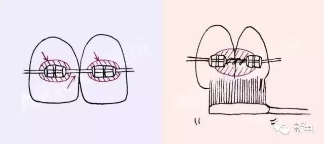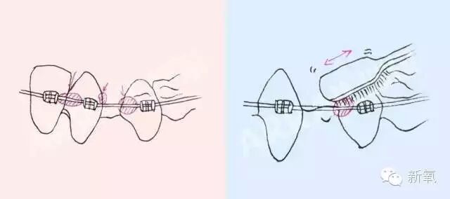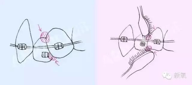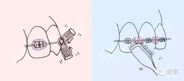 给戴钢丝托槽的亲一个更详细的清理图吧~托槽周围和弓丝下。