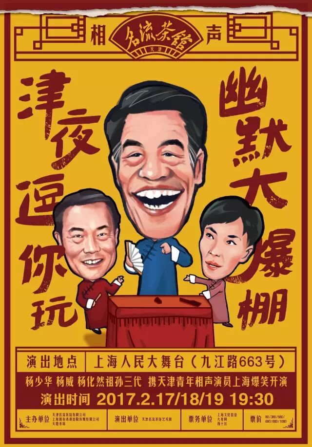 2017年2月17、18、19日三天,杨少华、杨威、杨化然祖孙三代将携天津青年相声演员将在上海人民大舞台上演,届时上海观众将足不出“沪”,体验地地道道、津味儿十足的天津相声。
