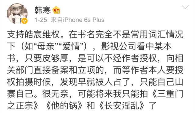 静宝以前看过一部改编自韩寒《一座城池》的同名电影,静宝预感韩寒书迷的骂声会被水军淹没……