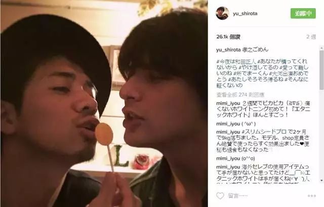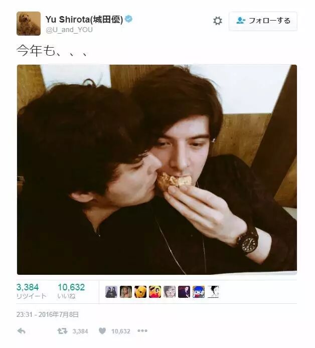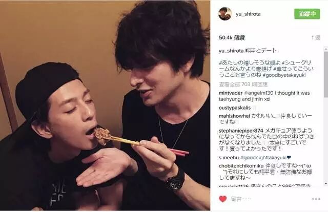 山田孝之晒出了自己给三浦翔平喂食的照片,写着「喔❤翔平你把人家口气弄那么清新,是打算要对人家做什么啦?」照片中还可以看到城田优在后面不甘心咬手帕的吃醋模样。