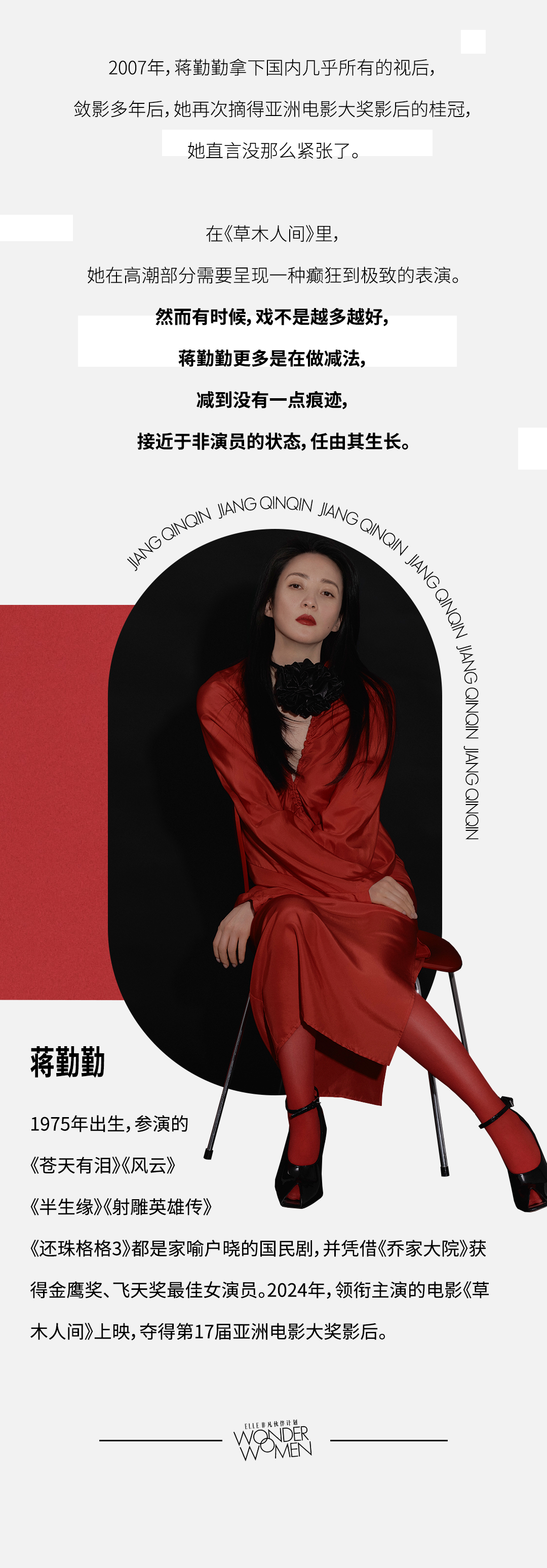 演吴苔花的几个月里她一点也不惜力,里面有“最真挚的、最真实的表达”。除了和同样不惜力的剧组之间的互相信任,还有很重要的原因——蒋勤勤觉得自己和吴苔花有共通处。