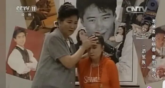 这个小品本意是为了展现那时候我国刚刚出现的青少年追星现象,蔡明饰演的小女生卧室墙上贴满了男偶像的海报,能辨认出来的有黎明、郭富城、刘德华和林志颖,都是那时候最受欢迎的帅哥明星。