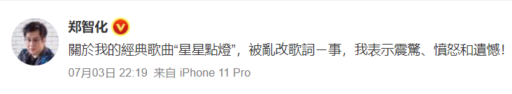 这次改词事件闹这么大的最后一个重要原因,当然是郑智化本尊出来抗议了。这好像也是改词风气出现这么久以来,第一次有原创者明确表示反对。