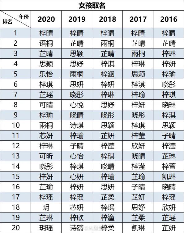 而女孩取名最多的是“梓晴”,连续5年都是排在榜首。